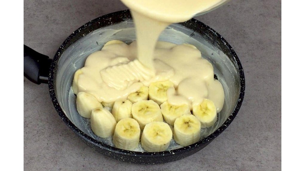 Visas triukas slypi technikoje. Bananai supjaustomi griežinėliais ir išdėliojami sviestu išteptame keptuvės dugne, o ant jų užpilama tešla. Kepant ant mažos ugnies po dangčiu, bananų krašteliai karamelizuojasi, suteikdami pyragui nepakartojamą auksinę plutelę ir saldų, beveik karamelės skonį. Kai pyragas apverčiamas, karamelizuoti bananai atsiduria viršuje – atrodo lyg iš konditerijos cecho.