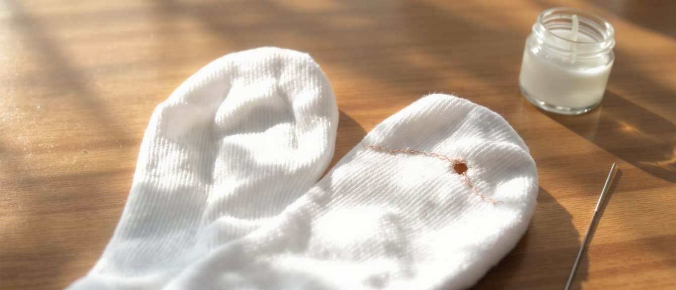 Laikinai, kol nėra laiko taisyti, padės skaidrus nagų lakas ant besiskleidžiančios siūlės arba moleskino pleistras iš vidaus — tai leis dėvėti kojines dar kelias dienas.