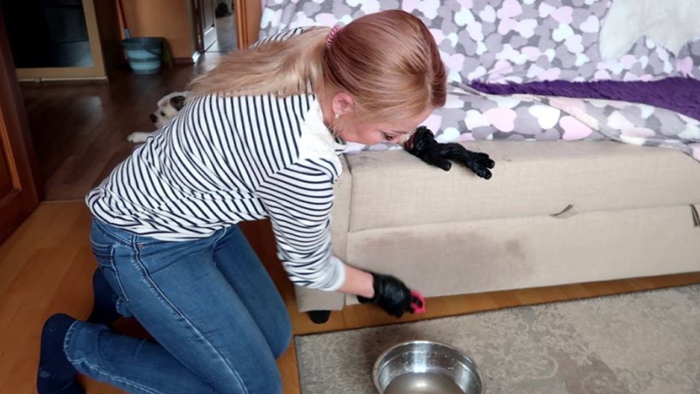 Prieš pradedant — svarbi taisyklė. Visada pirmiausia išbandykite tirpalą nepastebimoje sofos vietoje, pavyzdžiui, užpakalinėje pusėje ar apačioje. Taip įsitikinsite, kad mišinys nepakeis audinio spalvos.